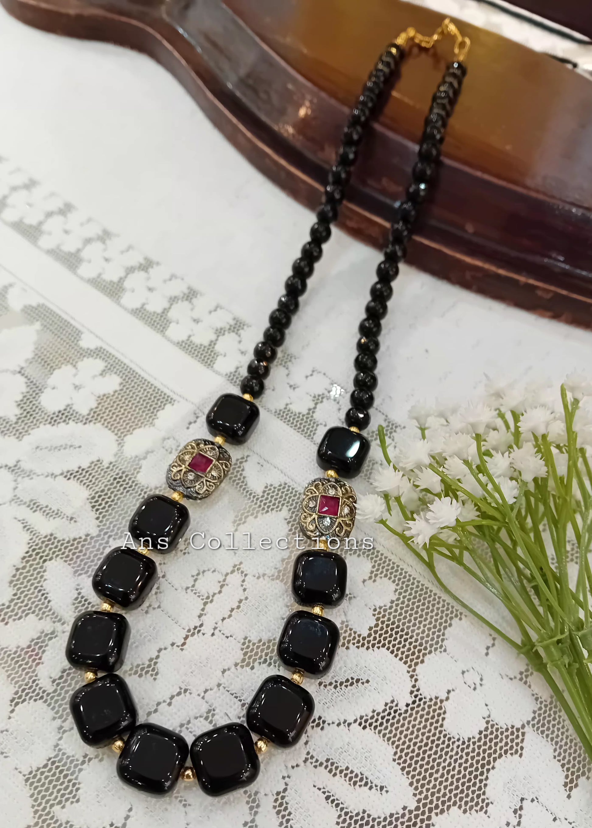 This Agate neckpiece features a beautifully crafted black square and round beaded design, with a focal square designer bead on both sides. With a length of 24 inches, this trendy and stylish piece is sure to add a touch of sophistication to any outfit. Elevate your style with the natural beauty and timeless elegance of this Agate neckpiece.