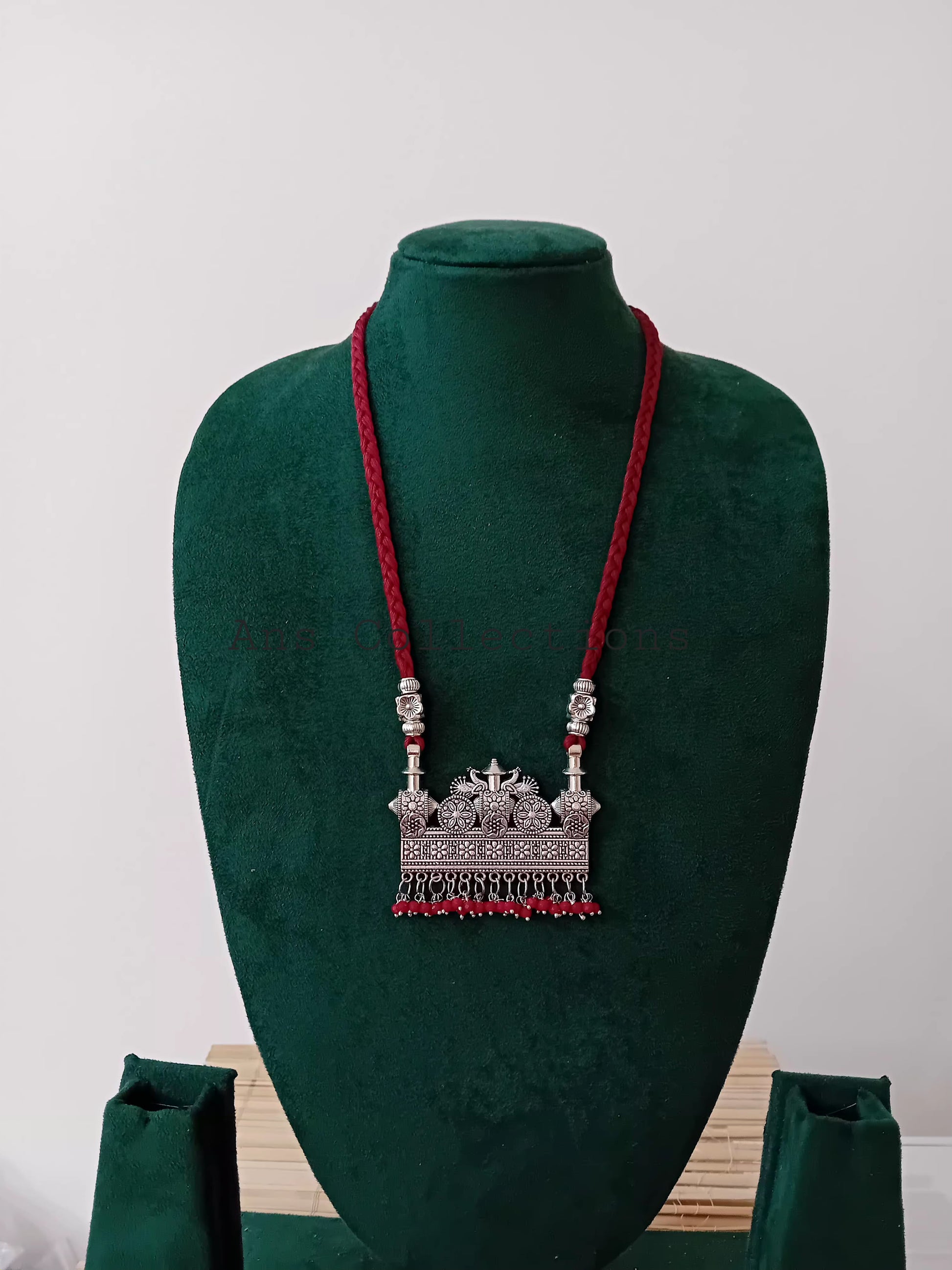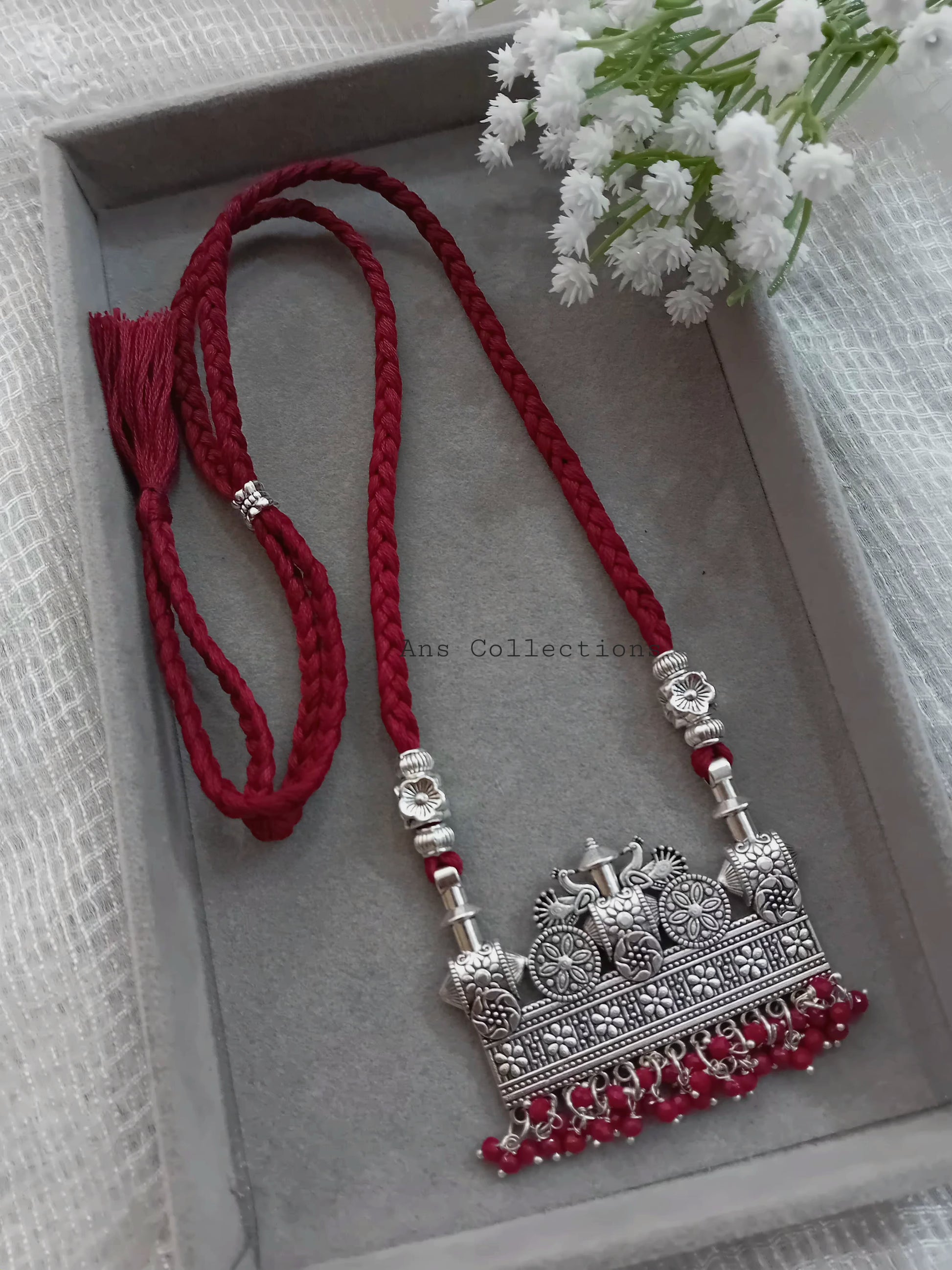 This braided thread jewellery is handmade with a beautifully crafted metal pendant attached to gunguroo beads. Its adjustable dori allows for a perfect fit every time. Elevate your style with this unique and stunning piece.