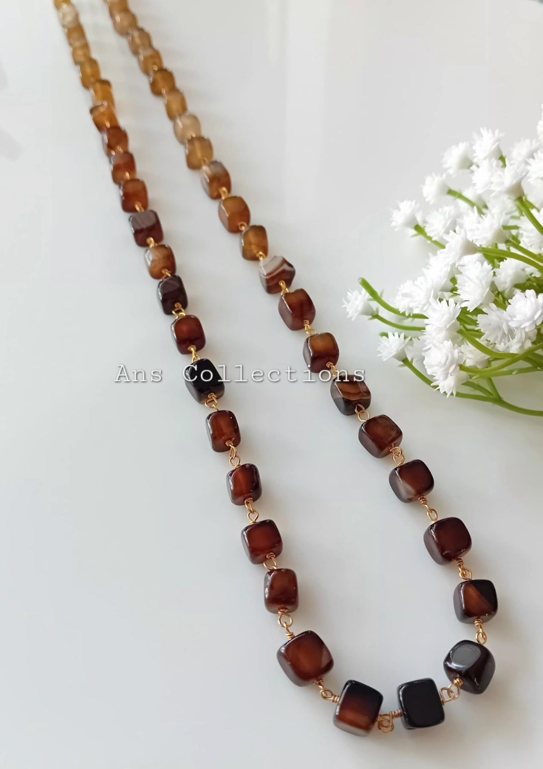 This box shaped agate neckpiece is crafted with gold plated wire, measuring 21 inches in length. The shades of brown add a unique touch to its elegant design. Enhance your style with the natural beauty and sophistication of this agate neckpiece.