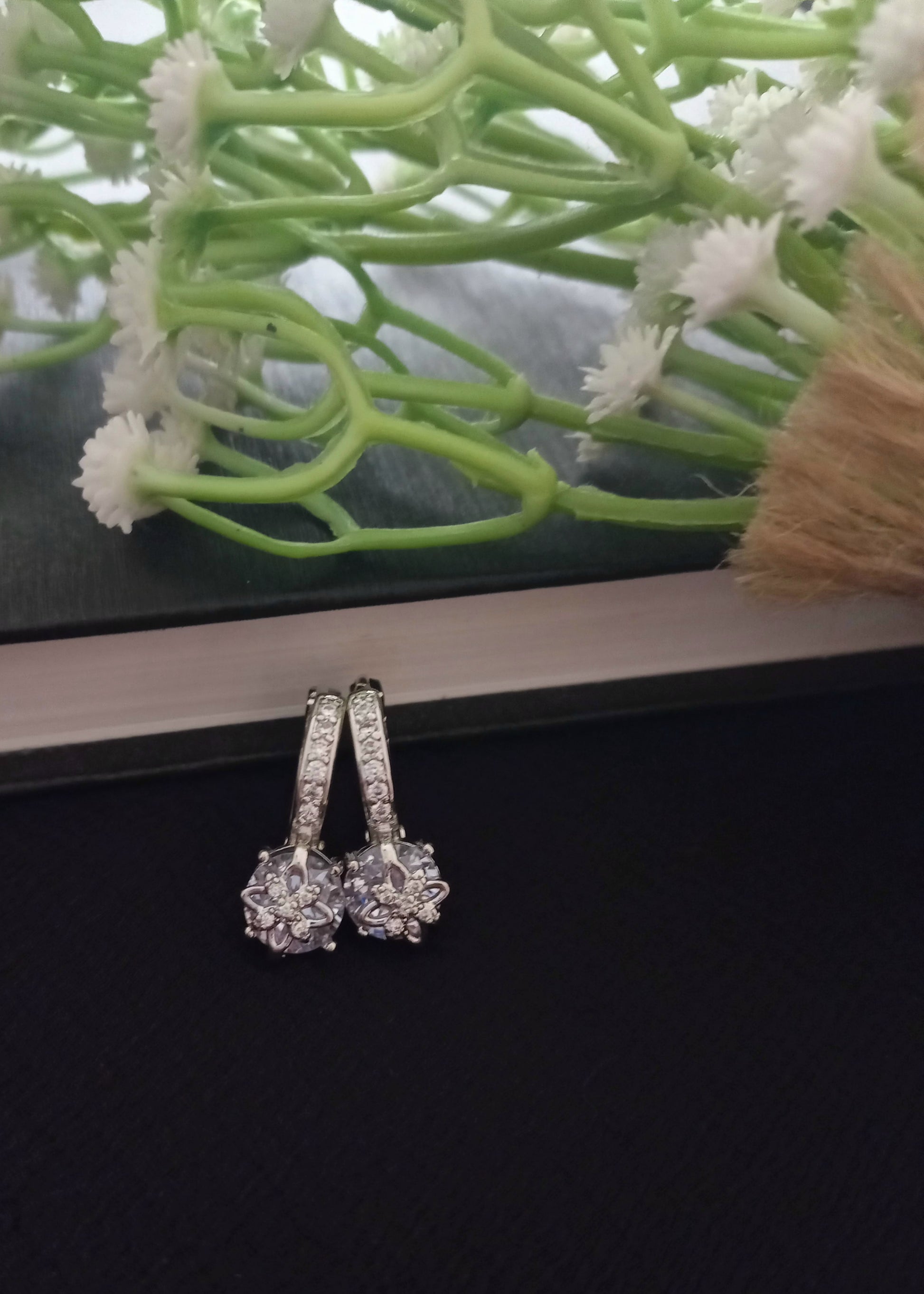 Expertly crafted, this rhodium plated earring features a pressing type design adorned with a stunning white stone. Its intricate details add a touch of elegance to any outfit. Experience the beauty and sophistication of these earrings for yourself.