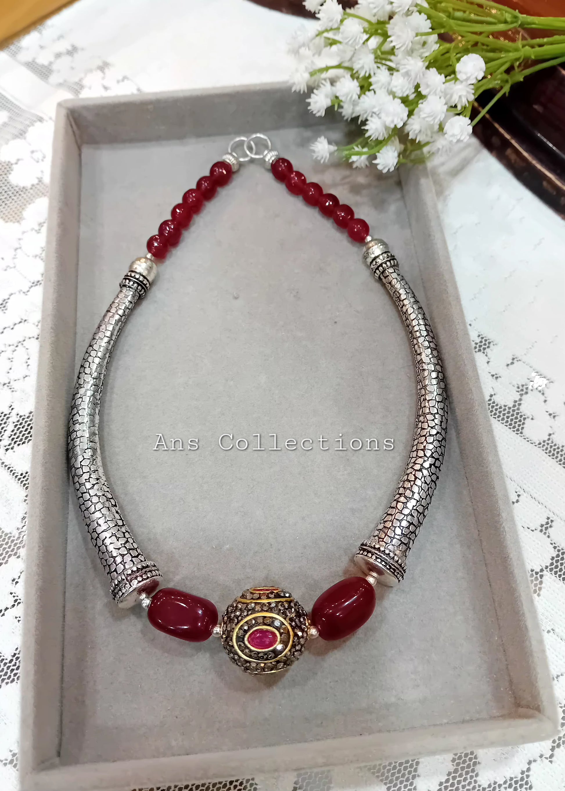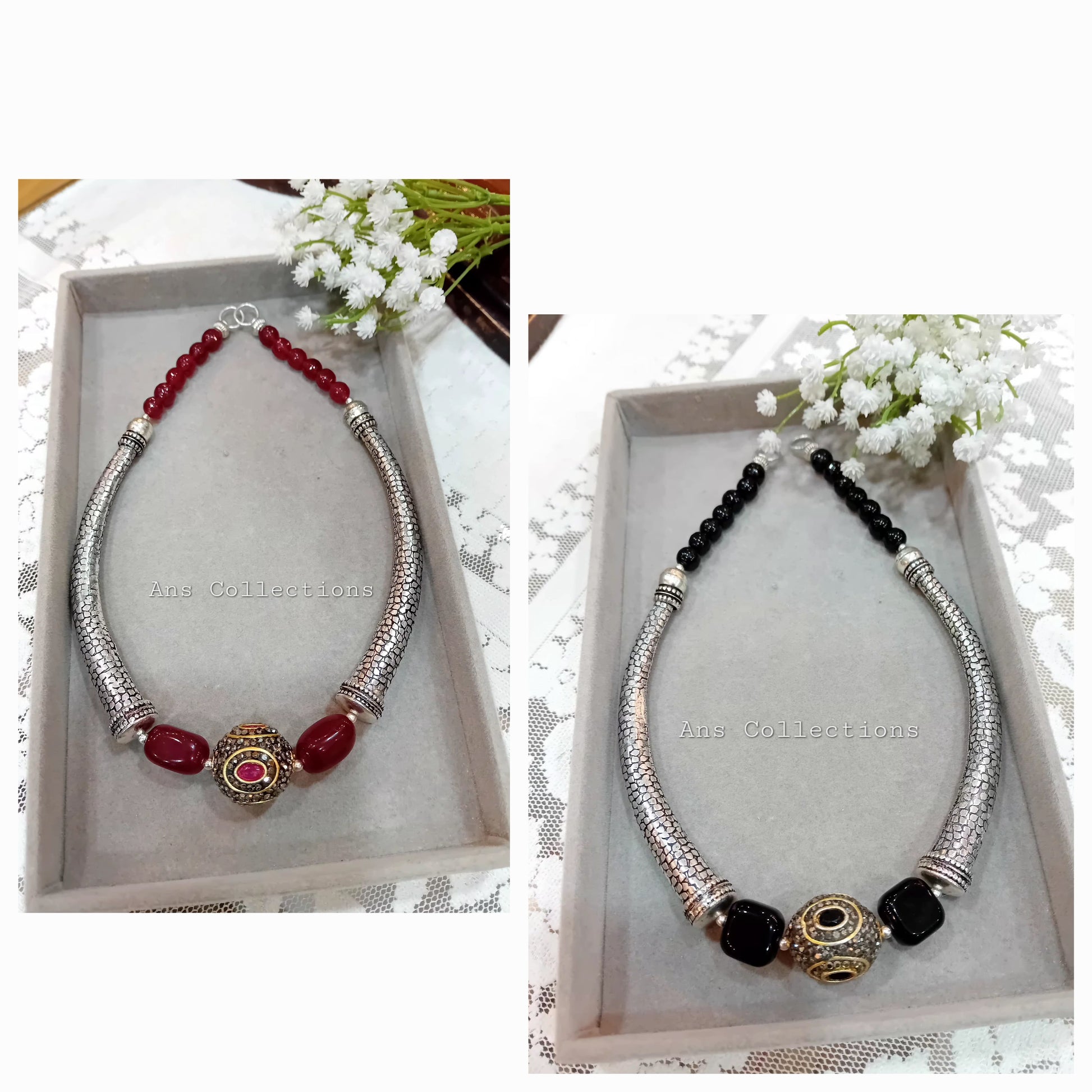 Complete your look with our Hasli model handmade jewellery. The central agate stone bead adds a touch of elegance and enhances the beauty of this statement neckpiece. Perfect for making a bold statement.