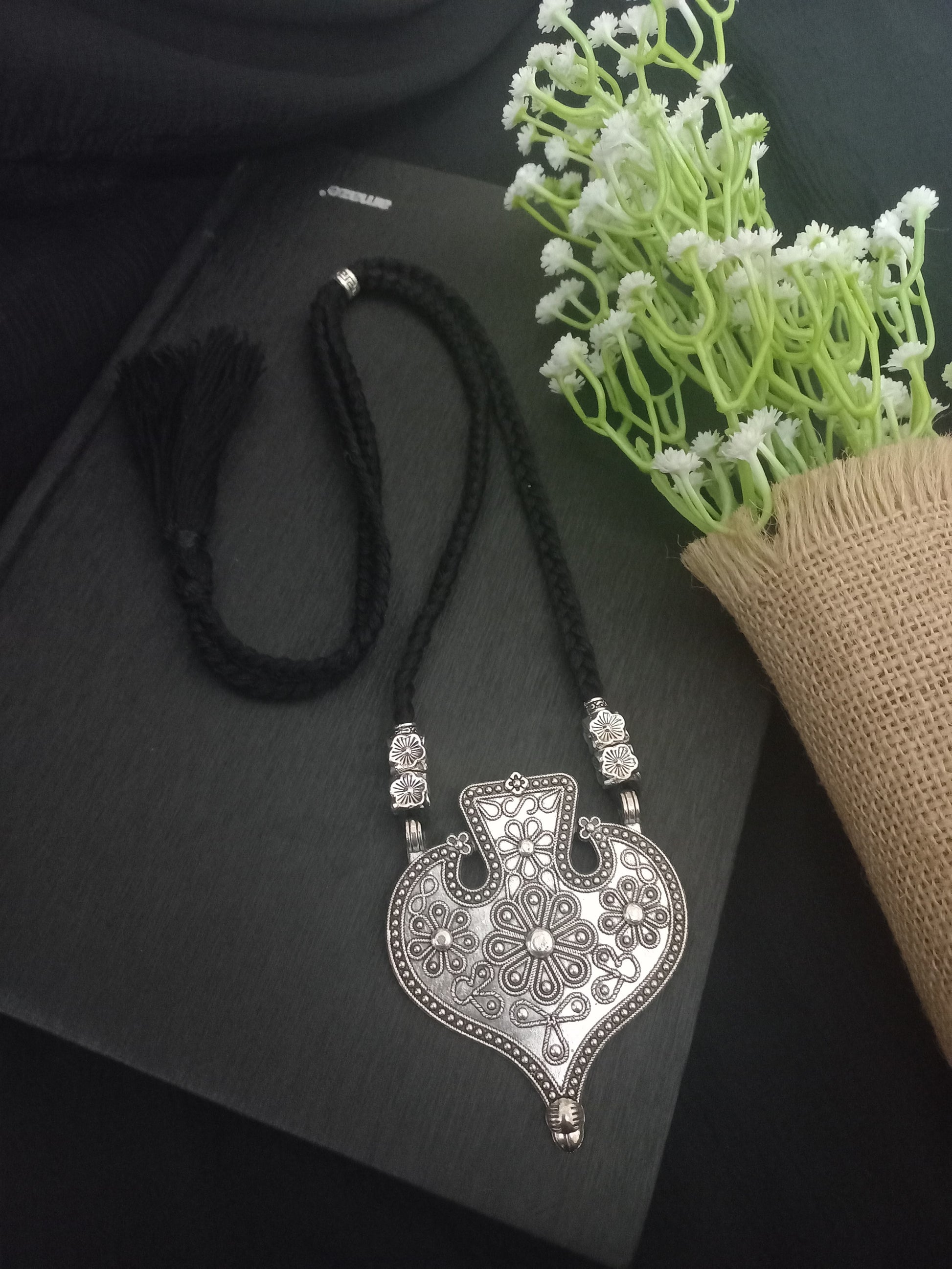 This oxidised metal leaf pendant design features a braided black thread and a long, adjustable chain Expertly crafted and seamlessly combining style and functionality, this necklace is versatile and perfect for any occasion. Elevate your look with this elegant and timeless piece.