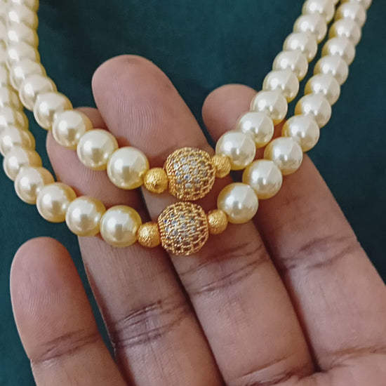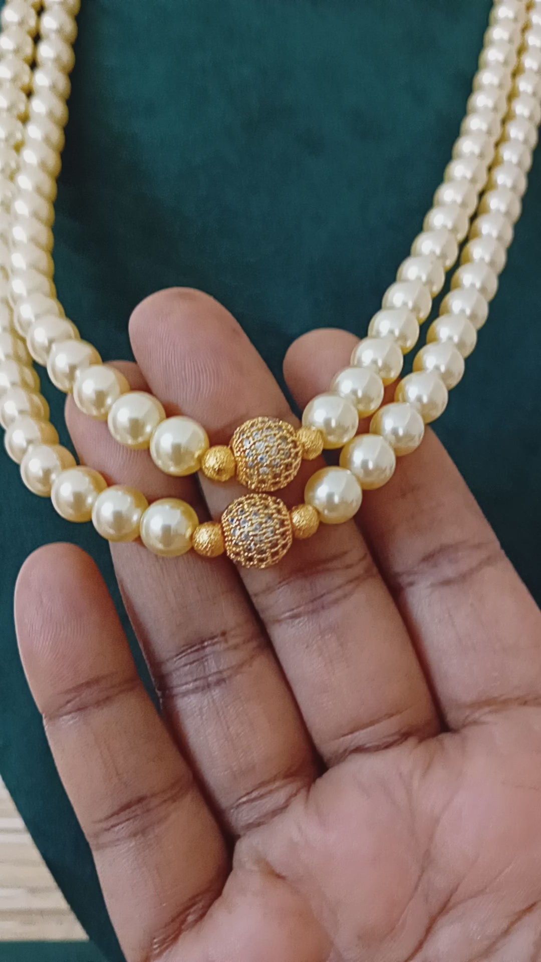 This cream-colored neckpiece is crafted with 8 mm sized swarovski pearls, adorned with designer beads and finished beautifully. The 24 inch length is adjustable with a back dori, making it both classy and elegant. Its unique design is perfect for adding a touch of sophistication to any outfit.